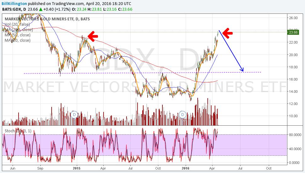 Seeing some bearish RSI divergence in GDX l, calling $17 in MAY looks like a good possibility, and at that point…LOAD UP! I certainly will be.